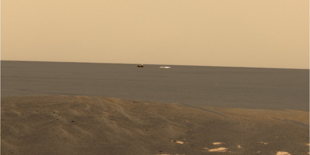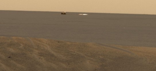 Opportunity hat seine etwa 440 m entfernt niedergegangene Backshell und seinen Fallschirm in Sichtweite. Hier ein am 09.02.2004 an Sol 15 in Richtung Südwesten aufgenommenes Bild aus dem Landekrater heraus, das dieses eindrucksvoll zeigt: