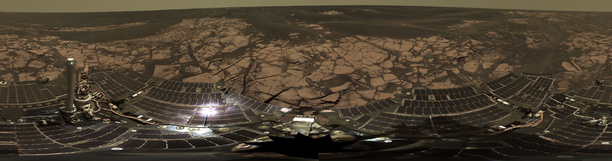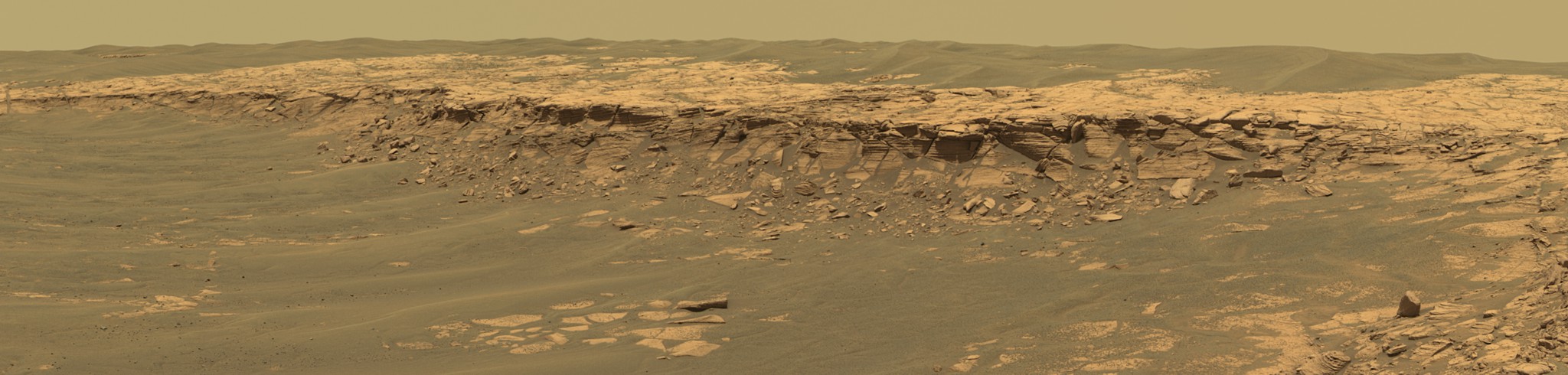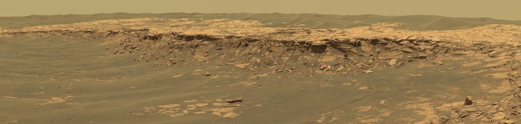 Die nächste Abbildung 10 zeigt den Mogollon Rim als Panorama in seiner ganzen farbigen Pracht, wie es die NASA am 06. März 2006 veröffentlicht hat. Der Rover war zu diesem Zeitpunkt schon entlang der Abbruchkante weitergefahren und hatte diesen Bereich im linken hinteren, flacheren Bereich verlassen: