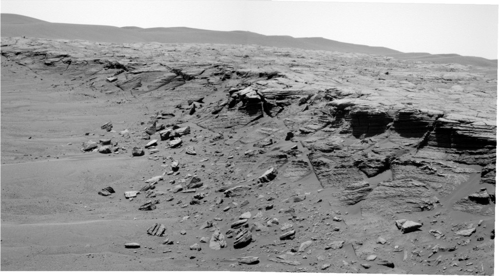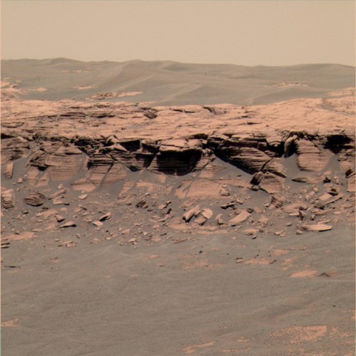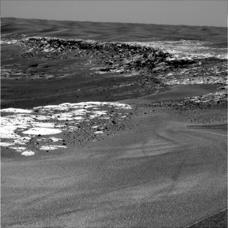 An Opportunitys Sol 741 auf dem Mars, dem 22. Februar 2006, gelang es dann endlich wieder, eine größere Wegstrecke seit dem Instrumentenarmproblem zurückzulegen. Der Rover bewegte sich etwa 25 m weiter in Richtung auf den vom Standort aus genau weiter südlich liegenden "Mogollon Rim" und seinen Bereich "Payson" zu (siehe oben Abb. 3 zur Übersicht). Der "Mogollon Rim"-Kraterrand weist deutlich zutage liegende Schichtstrukturen auf, ein weiteres interessantes Ziel für die Geologen. In den folgenden Tagen kam der Rover diesem Ziel schnell näher. Die nächsten Abbildungen 8 und 9 zeigen den Mogollon Rim, auch "Payson" genannt, aus der Nähe: