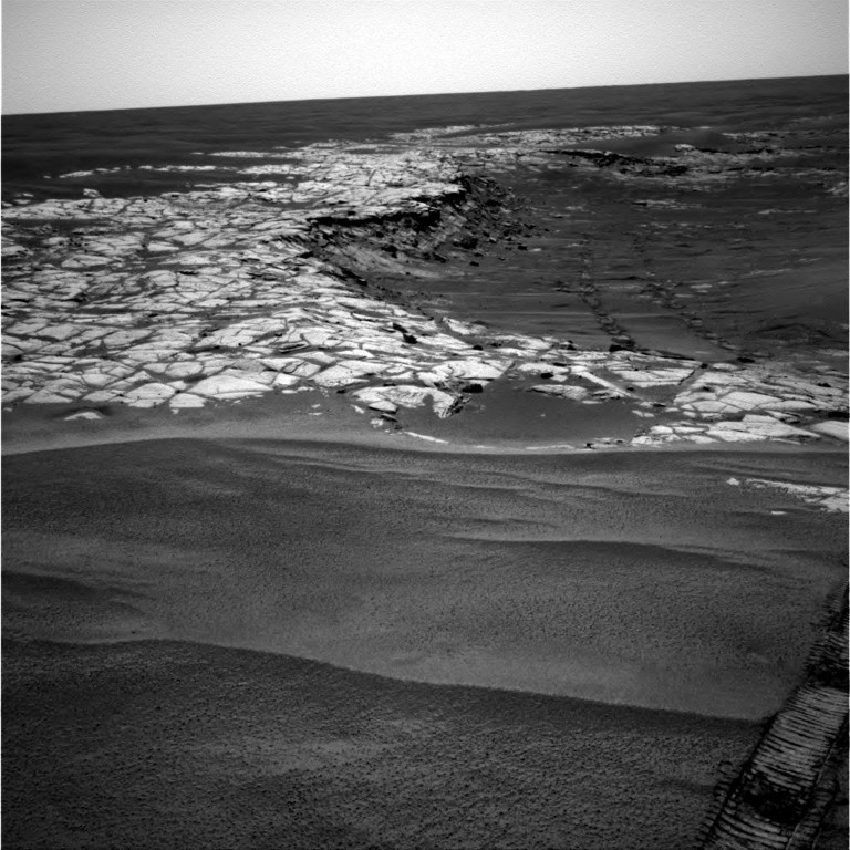 Am 07. März 2006, an seinem Sol 753 auf der Marsoberfläche, blickte der Rover zurück auf den Weg, den er gekommen war. So sah der Blick zurück auf "Payson" entlang des Mogollon Rim aus (links) und der Weg voraus auf den südlichen Rand des Erebus-Kraters (rechts):
