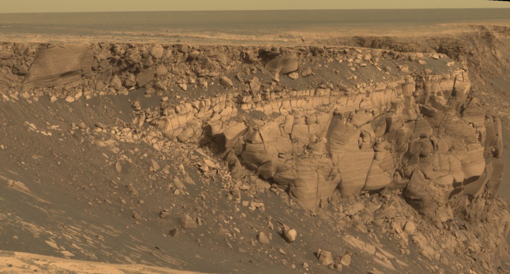 Abb. 10: Blick auf die Klippe "Cape Verde" nach der Rückkehr des Rovers zu seinem Ausgangspunkt. Rechts liegt die "Duck Bay", wo der Rover zum ersten Mal auf den Victoria-Kraterrand gestoßen war. |