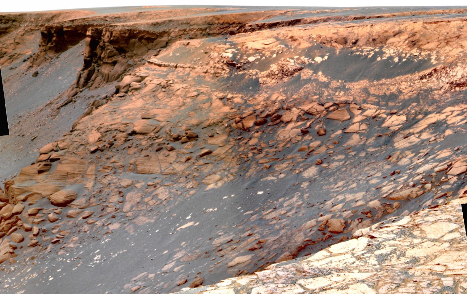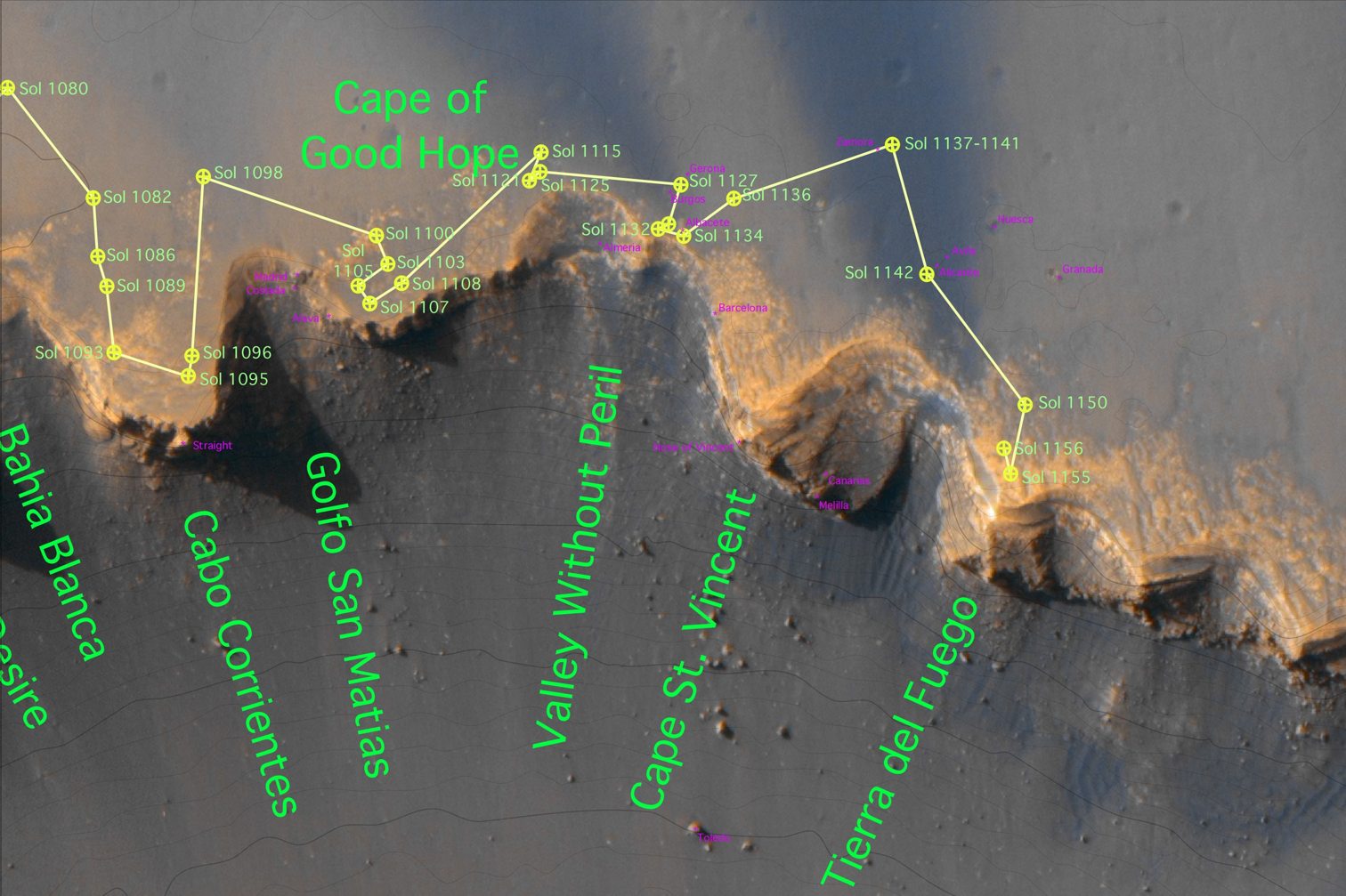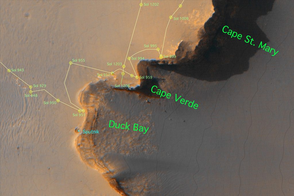 Der Rover war von rechts kommend an die Klippe "Cape Verde" an Sol 959 gefahren (in der Bildmitte der Abb. 10 liegend) und hatte diese nach links in Richtung auf "Cape St. Mary" um Sol 970 herum wieder verlassen.