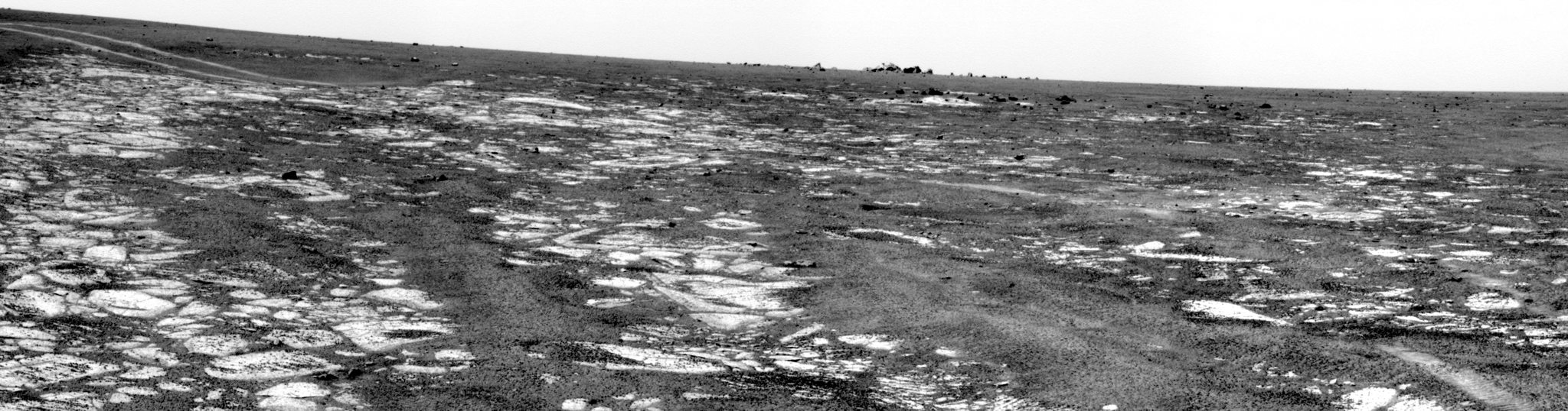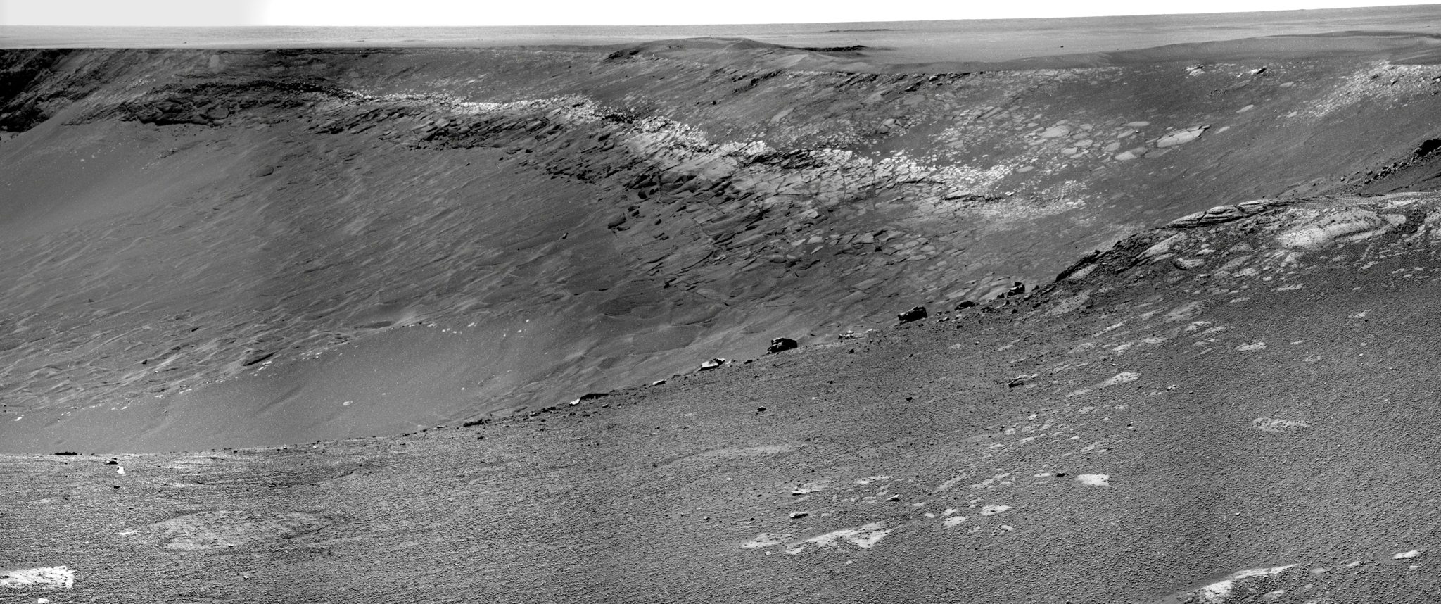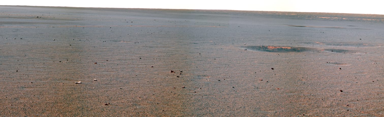 Die Felsen am Sichthorizont der Abb. 3 gehören zu dem "Granada" getauften kleinen Einschlagkrater in Richtung Norden (siehe auch Abb. 1), zu dem sich Opportunity nach dem Kurzaufenthalt an der Klippe "Tierra del Fuego" aufmachte. Der Rover erreichte "Granada" einen Tag später am 28. April 2007 und machte ein Bild von ihm: