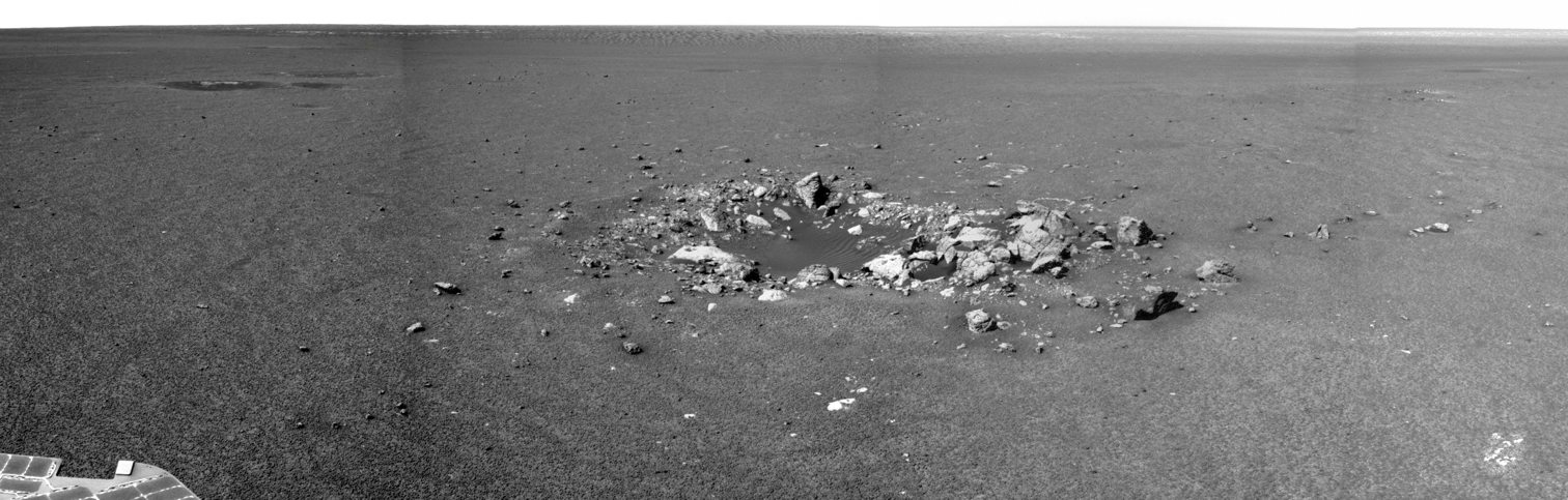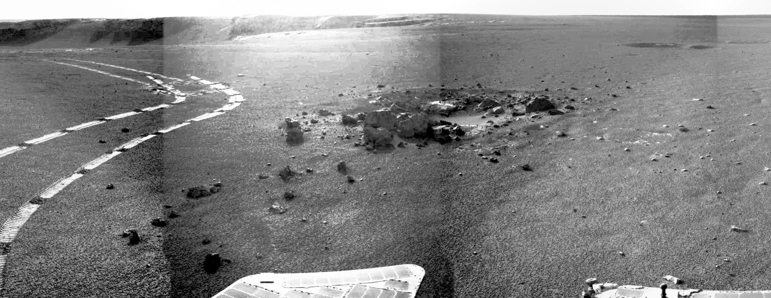 Am 29. April hatte Opportunity den Krater "Granada" passiert und der Blick zurück sah so aus: