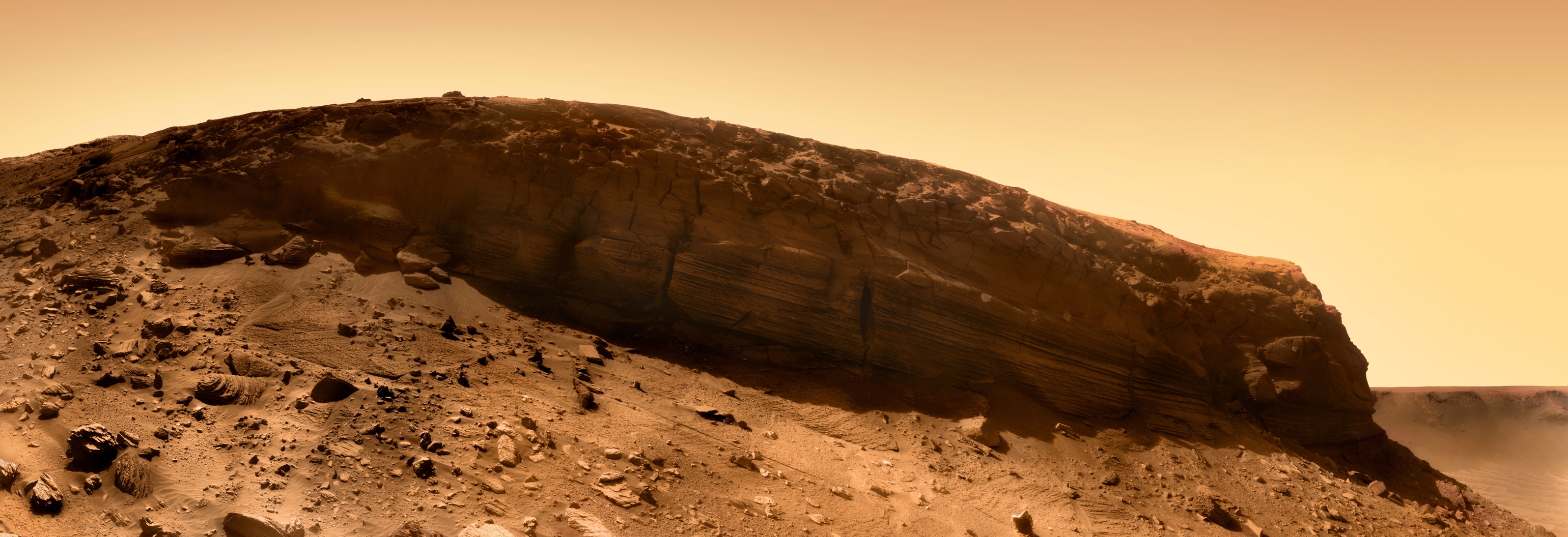 Abb. 6: Cape Verde Panorama an Sol 1570, aufgenommen aus einer Entfernung von 10 m vom unteren Basisrand (Credits: James Canvin at www.nivnac.co.uk). |