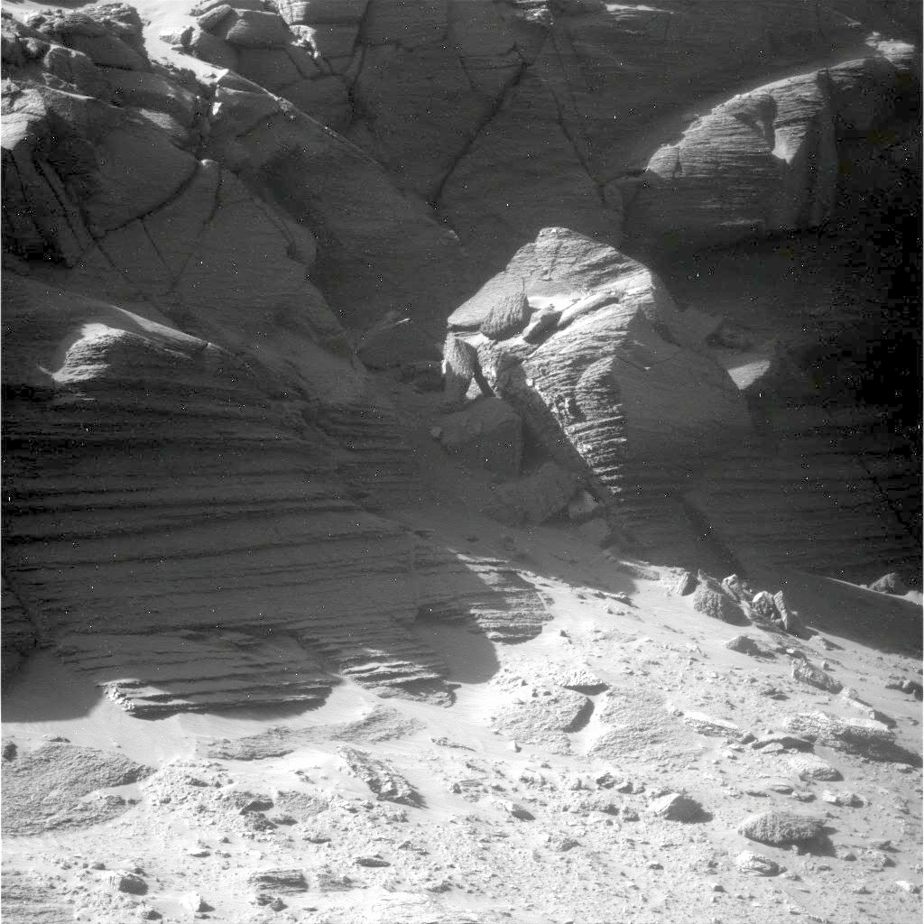 Nachdem Opportunity wieder frei war, kam der Rover seinem vorläufigen Ziel, der Basis der Klippe Cape Verde, recht schnell nahe. Die folgenden Bilder zeigen die Situation an Sol 1565, dem 19. Juni 2008, als Opportunity sich dem unteren Bereich von Cape Verde bis 10 m genähert hatte: