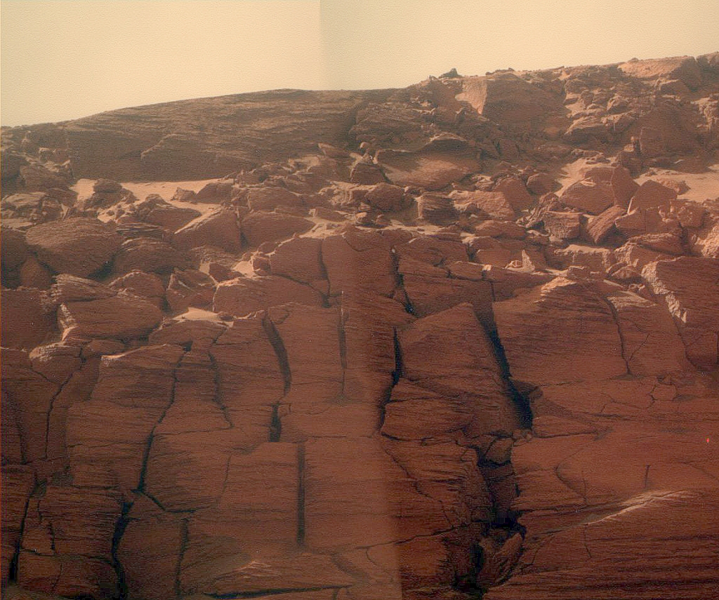 Wegen seiner Nähe zur Klippe und der im Südwinter relativ tief stehenden Sonne lag der Rover auf seiner Position morgens im Schatten und bekam nicht die volle Menge Sonnenlicht zur Aufladung seiner Batterien ab. Glücklicherweise war der Blick nach Osten, wie dieses Bild zeigt, relativ frei und die Situation daher nicht ganz so kritisch. Die Rover-Fahrer mußten allerdings aufpassen, Opportunity nicht in ein gefährliches Energiedefizit zu manövrieren.