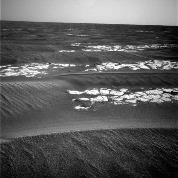 Letztlich waren keine tiefergehenden Gründe für das Festsitzen in Erfahrung zu bringen und der Rover bewegte sich ab Ende Juni 2005 vorsichtig weiter. Er fuhr zunächst etwa 50 m auf seinen alten Spuren zurück in Richtung Norden, bevor er dann einen 90° Schwenk nach Osten über eine kleine Düne hinweg in das benachbarte Dünental vornahm (siehe Karte oben auf dieser Seite). Glücklicherweise verliefen die Dünenkämme an dieser Stelle der Marsoberfläche alle in Nord-Süd-Richtung, so dass der Rover immer in den Dünentälern bleibend ohne Probleme weiter nach Süden vorstossen konnte. Die weitere Fahrt wurde allerdings langsam und vorsichtig durchgeführt, immer wieder durch neue Bilder abgesichert, um ein weiteres Festsitzen auf jeden Fall zu verhindern. Die Dünen an dieser Stelle waren alle etwa 30-50 cm hoch, das folgende Bild zeigt in einem Blick nach Westen die Topologie des Geländes an dieser Stelle recht deutlich: