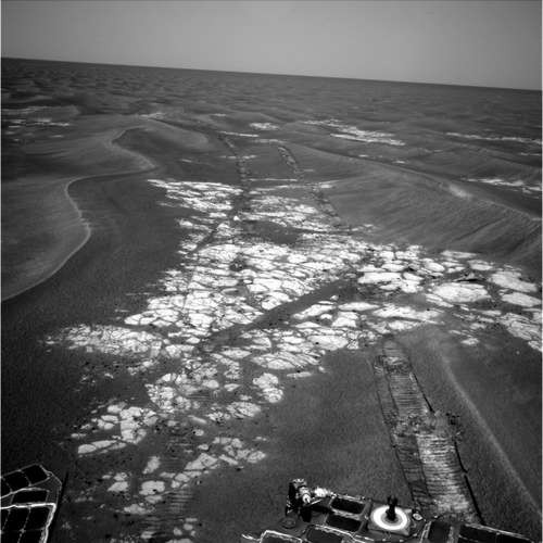 Insgesamt kam der Rover auf diese Weise recht problemlos weiter nach Süden voran und hatte sich Ende Juli 2005 dem stark verwitterten und fast vollständig unter Sand begrabenen Krater Erebus bis auf etwa 100 m genähert. Direkt vor und besonders hinter Erebus wurde das Gelände wieder felsiger und weniger sandig, was das Fortkommen des Rovers beschleunigte. An Sol 543 auf dem Mars, dem 03.08.2005 auf der Erde, zeigten sich auf den vom Rover übermittelten Bildern endlich wieder felsigere Bereiche in den bis dahin endlosen Sanddünen des Gebietes südlich des Kraters Voyager. Damit wurden die ersten Vorzeichen für die Annäherung an den Krater Erebus sichtbar wie die nachfolgenden Bilder zeigen: