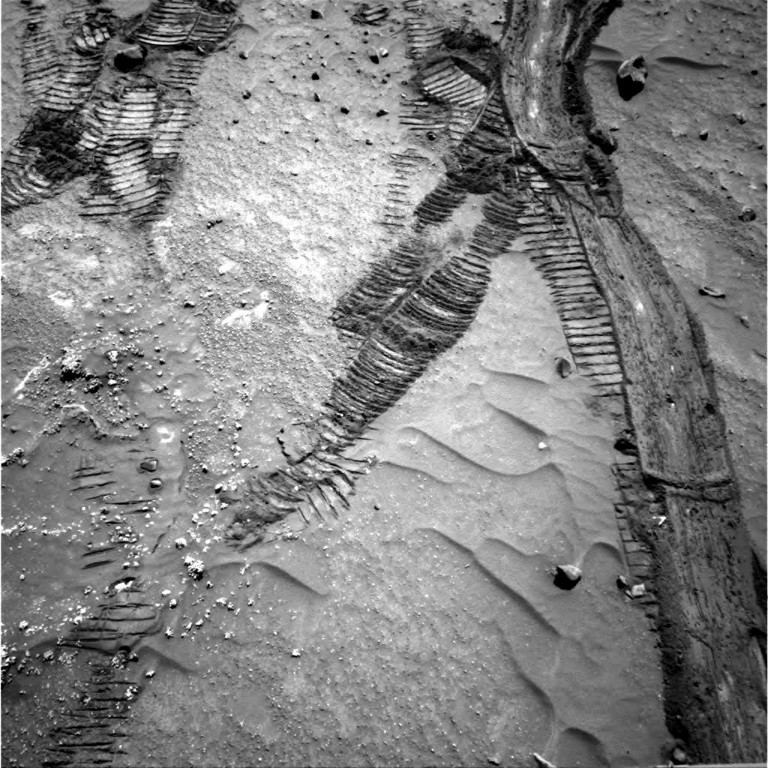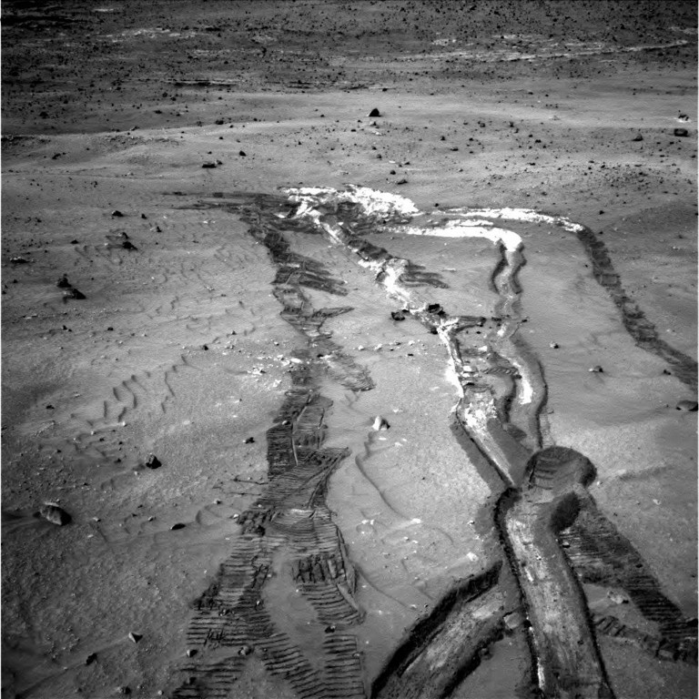 Abb. 12: Blick nach Südosten auf die in den Marsboden gezeichneten Spuren vor der Wende des Rovers |