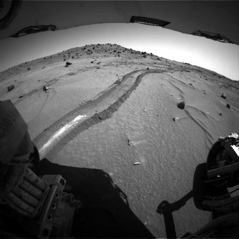 Am 10. April (Sol 804) hatte der Rover die Wende geschafft und sich ein Stück aus dem gefährdeten Bereich herausbewegt. Zu diesem Zeitpunkt hatte er die Home Plate fast wieder erreicht. Abbildung 8 zeigt mit Blick nach Südosten die Problemzone. Im Hintergrund der Wendebereich mit den hellen Sulfatsalzen, in denen sich der Rover ein bisschen festgefahren hatte. Sie liegen verdeckt in einem kleinen, mit Sand aufgefüllten Krater, in den der Rover ursprünglich von links kommend hineingefahren war.