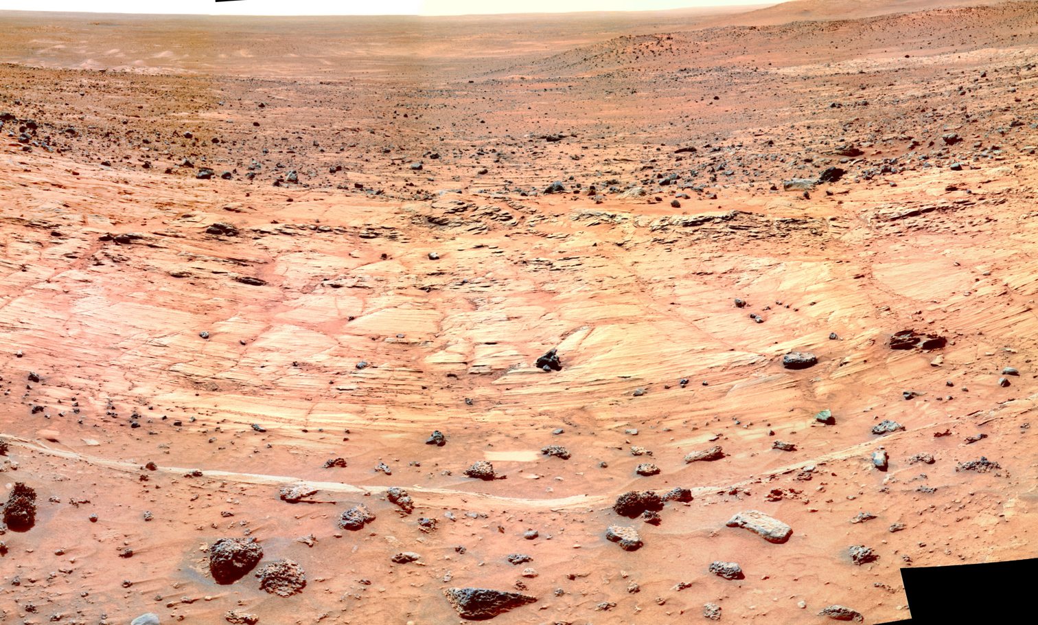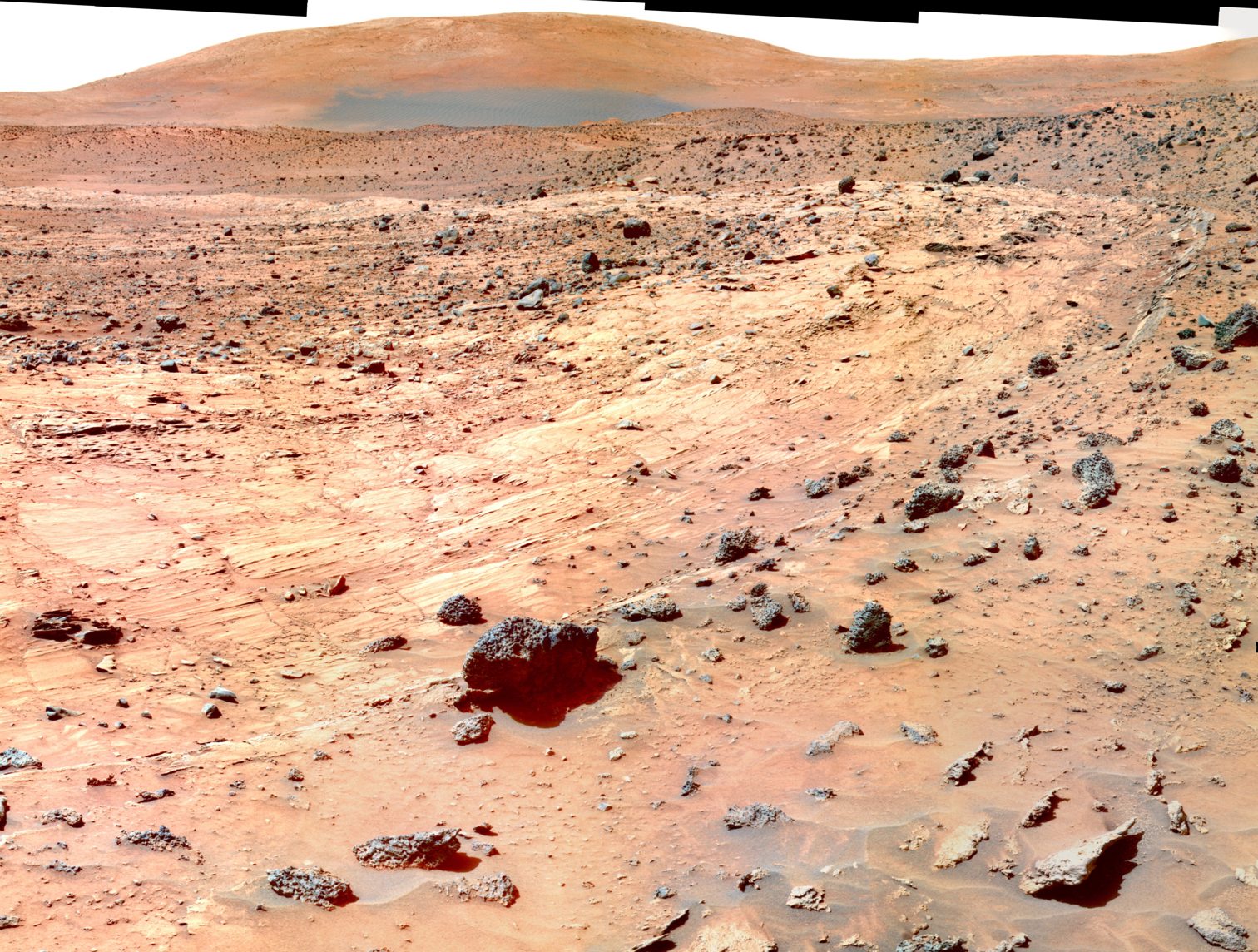 Abb. 4: Blick nach Süden. Die Hügel hinten am Horizont bilden die bis zu 2 km hohe Kraterwand des Gusev-Kraters in 80 km Entfernung. |