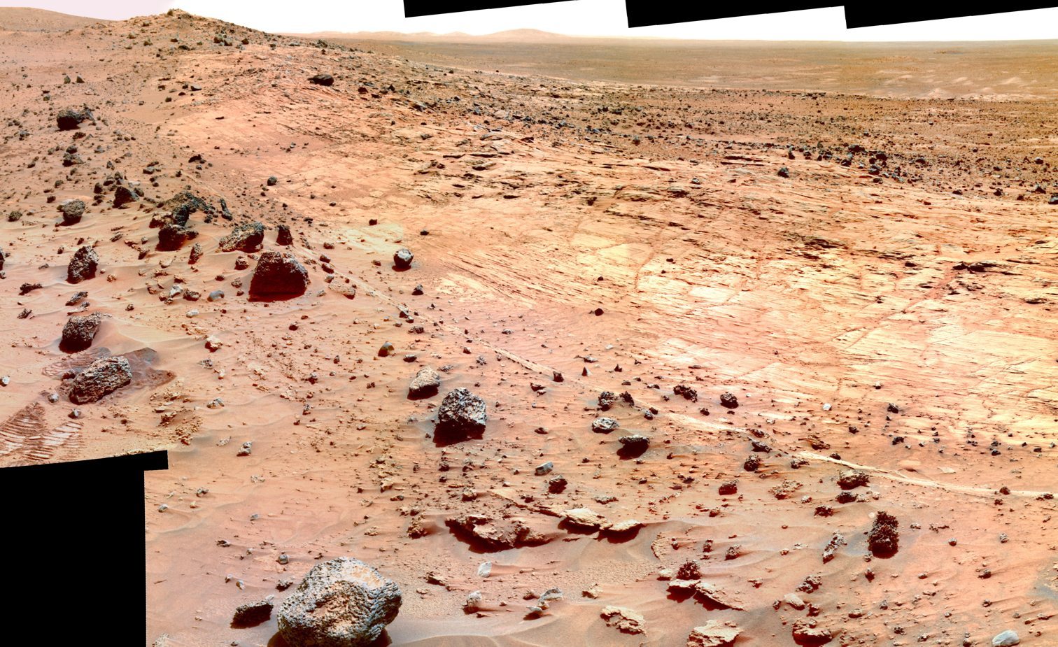 Abb. 3: Blick nach Westen über die Home Plate hinweg in die Gusev-Ebene. Irgendwo hinter den Hügeln rechts war Spirit im Januar 2004 gelandet. |