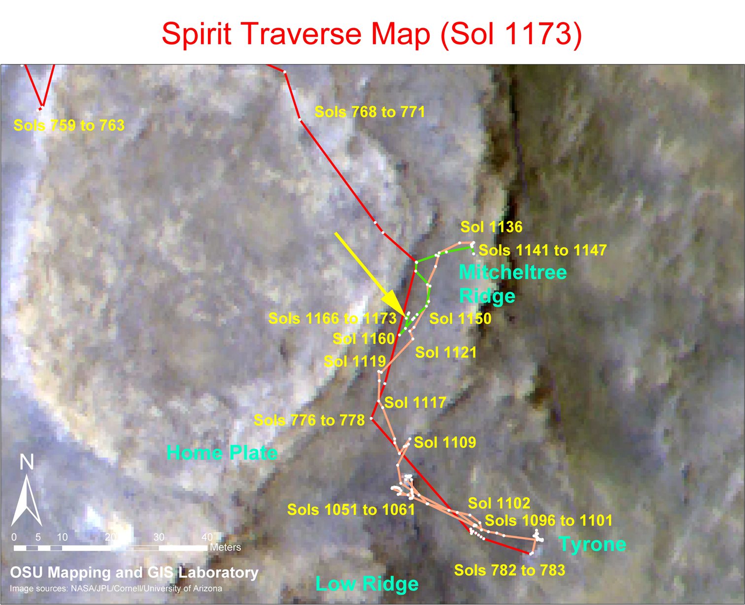 Ende April 2007 befand sich Spirit immer noch zwischen der "Home Plate" im Westen und der "Micheltree Ridge" im Osten. Die genaue Position des Rovers zeigt folgendes Orbitalfoto von Sol 1173, dem 24. April 2007: