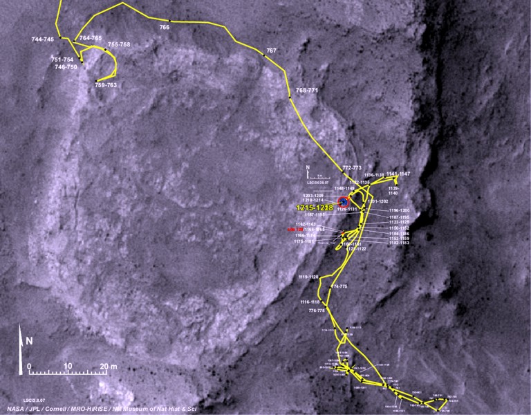Die detaillierte Untersuchung von Felsen am Rande der Homeplate mit allen Bordinstrumenten nahm viel Zeit in Anspruch, so dass sich Spirit bis Mitte Juni 2007 nicht entscheidend weiterbewegte und in der Nähe des Randes der Home Plate blieb. Das nächste Bild zeigt seine Position als Orbitalfoto an Sol 1220, dem 10. Juni 2007 (Klicken auf das Bild liefert eine vergrößerte Ansicht):