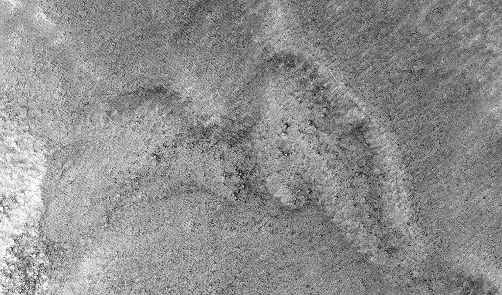 Übersichtsbild des "Marsgesichts" in Cydonia. Das Zentrum dieses Bildes ist zentriert bei 40.7° Höhe und 350.5° östliche Länge, aufgenommen aus einer Höhe von 299.4 km um 15:29 Uhr lokaler Marszeit am Aufnahmeort. Die höchste Auflösung ist 30 cm pro Pixel. Die Sonne bescheint die Szenerie von links mit einer Höhe von etwa 17° über dem Horizont.