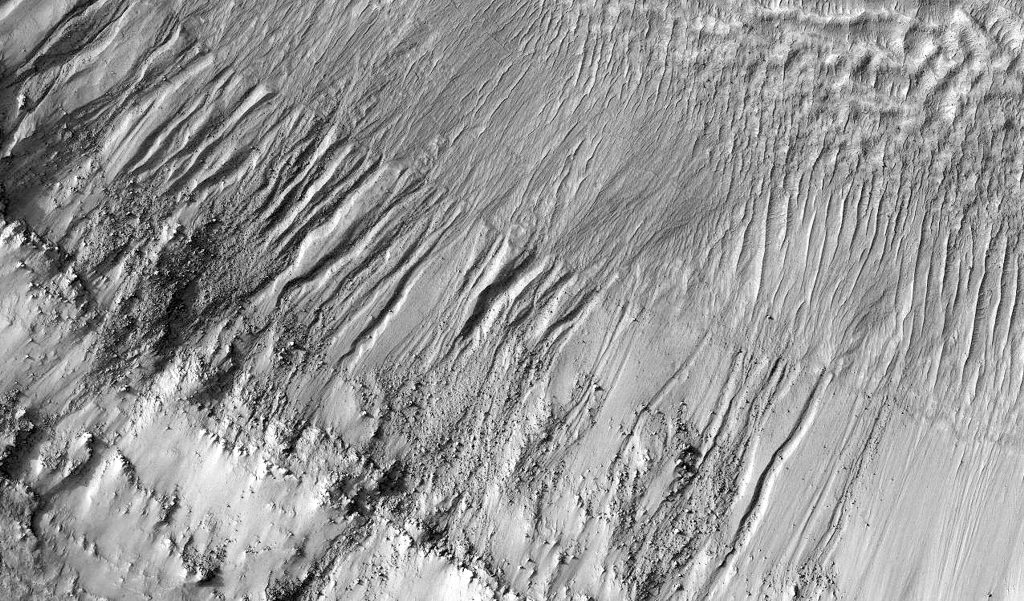 Der etwa 10 km durchmessende Krater im Gebiet "Terra Cimmeria" zeigt wie viele andere Krater in dieser Gegend eine besondere Struktur im Kraterboden, denn der Krater ist aufgefüllt mit einer viskosen Mischung aus Felsen, Sand und Eis. Diese Füllung geschah erst nach der Kraterentstehung, vermutlich durch Verflüssigungen, die durch die Energie des Kratereinschlages entstanden sind. Diese Interpretation setzt eine wässrige Eisschicht unter der Oberfläche an dieser Stelle voraus. Die folgenden Bilder zeigen Ausschnitte der felsigen Kraterwand, die mit einem starken Gefälle in die viskose Schicht des Kraterbodens übergeht. Die Grenzschicht zwischen der felsigen Struktur des Kraterrandes und der Bodenfüllung lässt sich über mehrer Kilometer hinweg entlang des Kraterbodens als eine zusätzliche Stufe in der Kraterwand verfolgen.