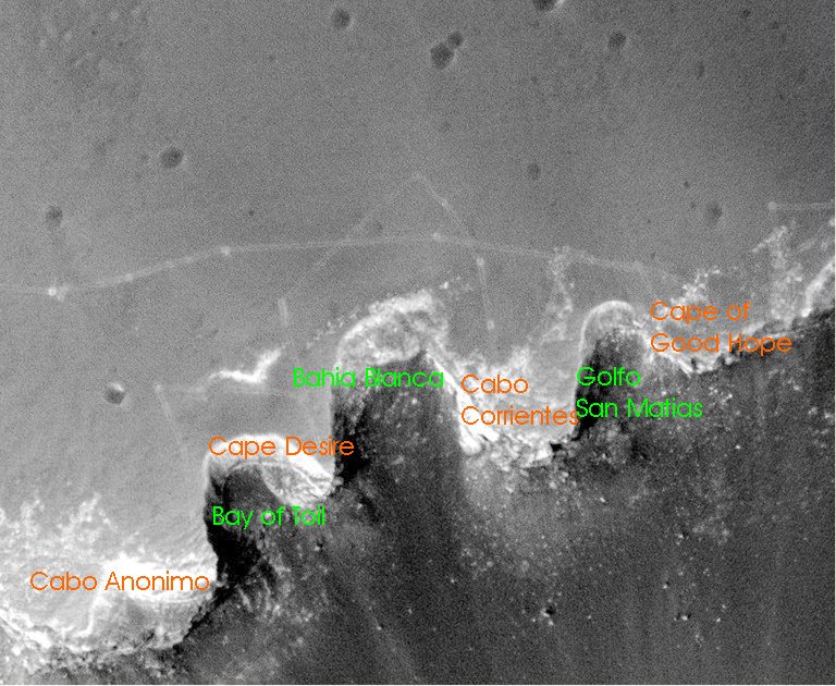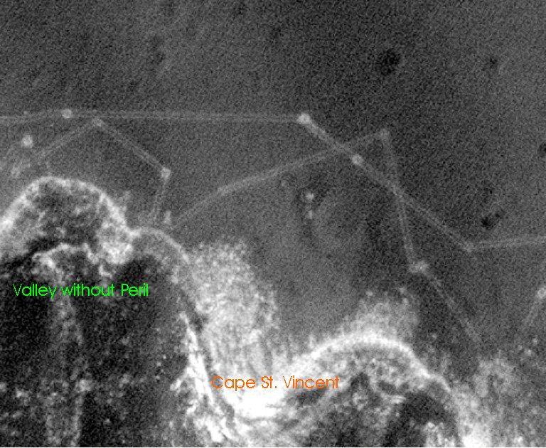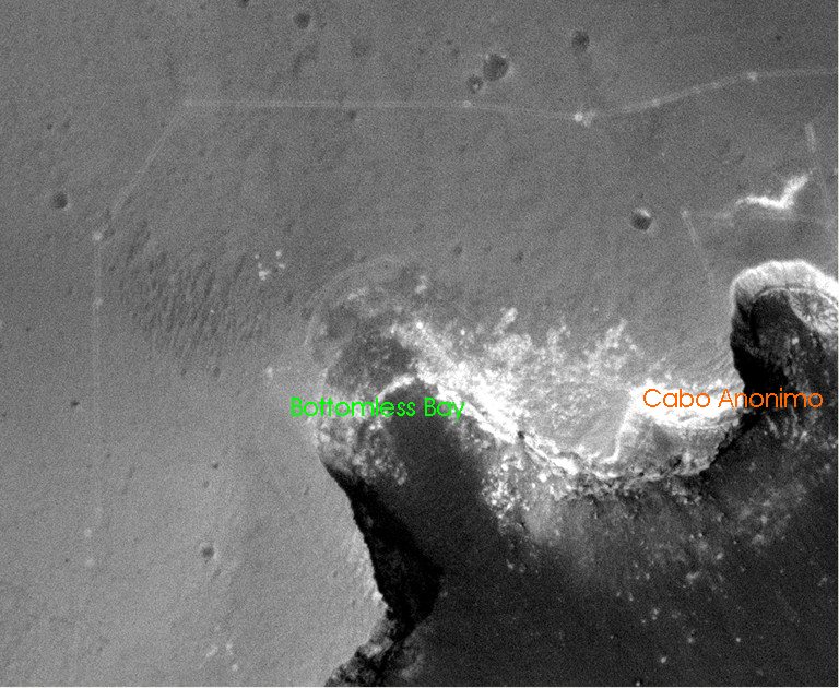 | Ein weiterer, bisher namenloser kleiner Krater, etwa in der Größe von Endurance. Dieser Krater liegt etwa 6 km südöstlich von Victoria und könnte ein weiteres Ziel von Opportunity sein, falls der Rover noch einige Zeit auf dem Mars überleben sollte. |
