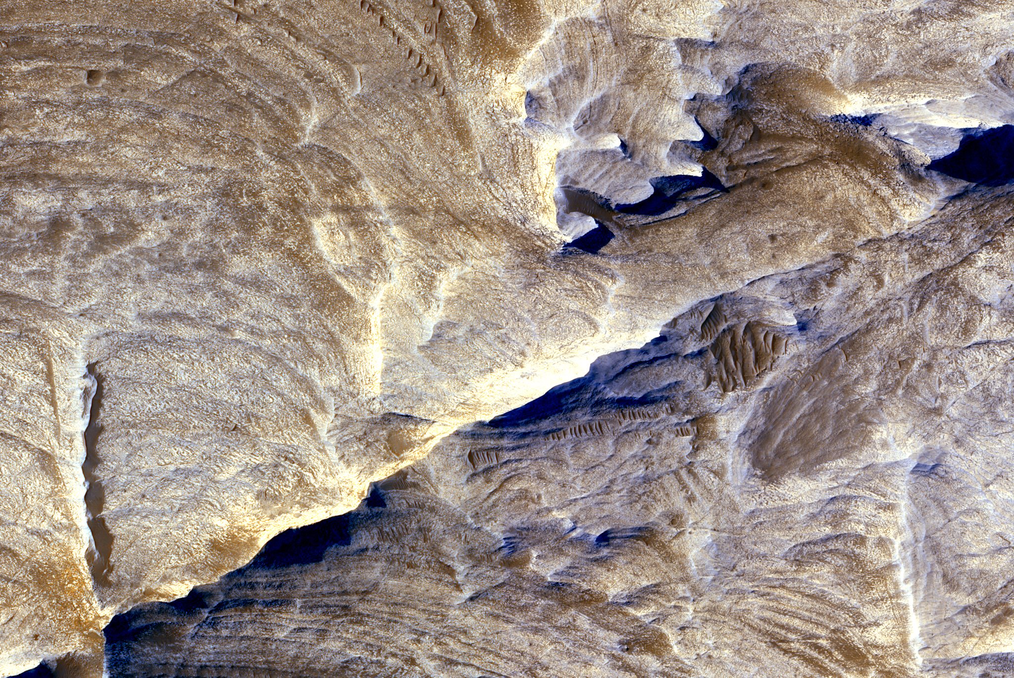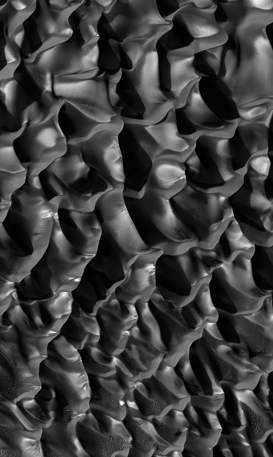 Ein Dünenfeld im Innern des Proctor-Kraters in der südlichen Hemisphäre des Mars zeigt die ausserordentliche Vielfältigkeit der geologischen Formationen auf dem Mars. Zur Aufnahmezeit herrschte Winter. Die Wissenschaftler vermuten, dass die helleren Bereiche entweder aus Kohlendioxid- oder Wassereis bestehen.