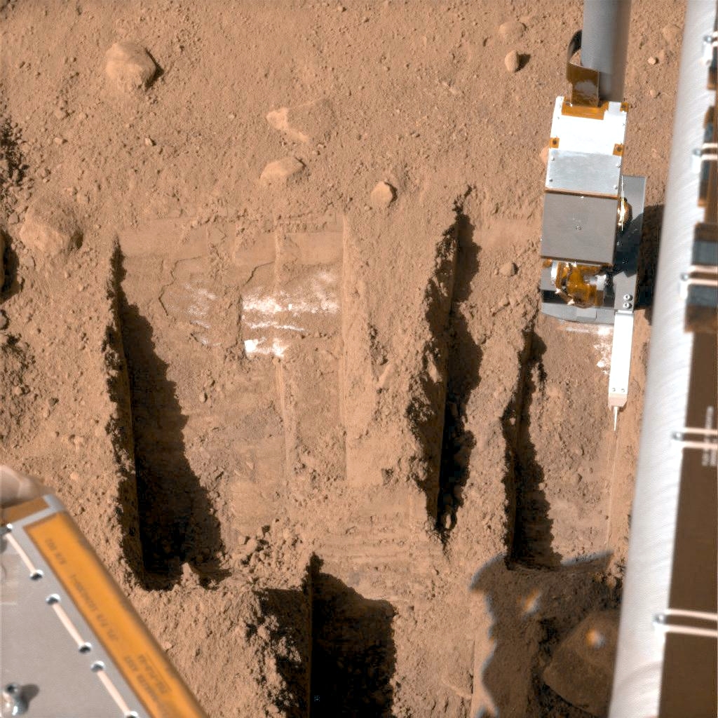 Abb. 2b: Auch unter "Stone Soup" setzt sich der bereits in "Dodo-Goldilock" gefundene untermarsianische Wassereisblock fort, siehe das Eis im oberen Bereich des Grabens, teilweise vom Probenarm verdeckt. Allerdings war jetzt klar, daß dieser Eisbereich direkt unter dem Lander in die Tiefe des Marsbodens abkippte. Die Abdeckung mit sandähnlichem Bodenmaterial war umso dicker, je näher man sich nach "Süden" hin auf den Lander zubewegte. |