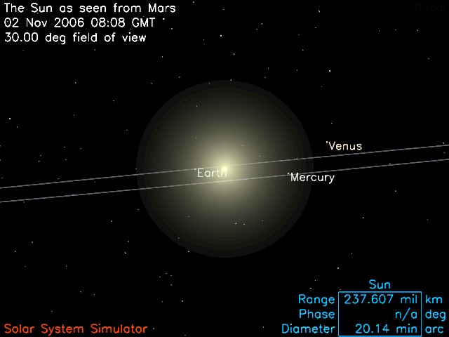 Die solare Konjunktion zwischen Erde und Mars hat zum Abbruch der Kommunikationsverbindungen mit dem Mars geführt, da die direkte Verbindung zwischen Terra und Mars nun durch die oberen Schichten der Sonnenkorona führt. Der Höhepunkt der solaren Konjunktion wird am 23. Oktober erreicht sein und erst Anfang November wird die Kommunikation mit den Raumschiffen am Mars wieder aufgenommen werden können. |