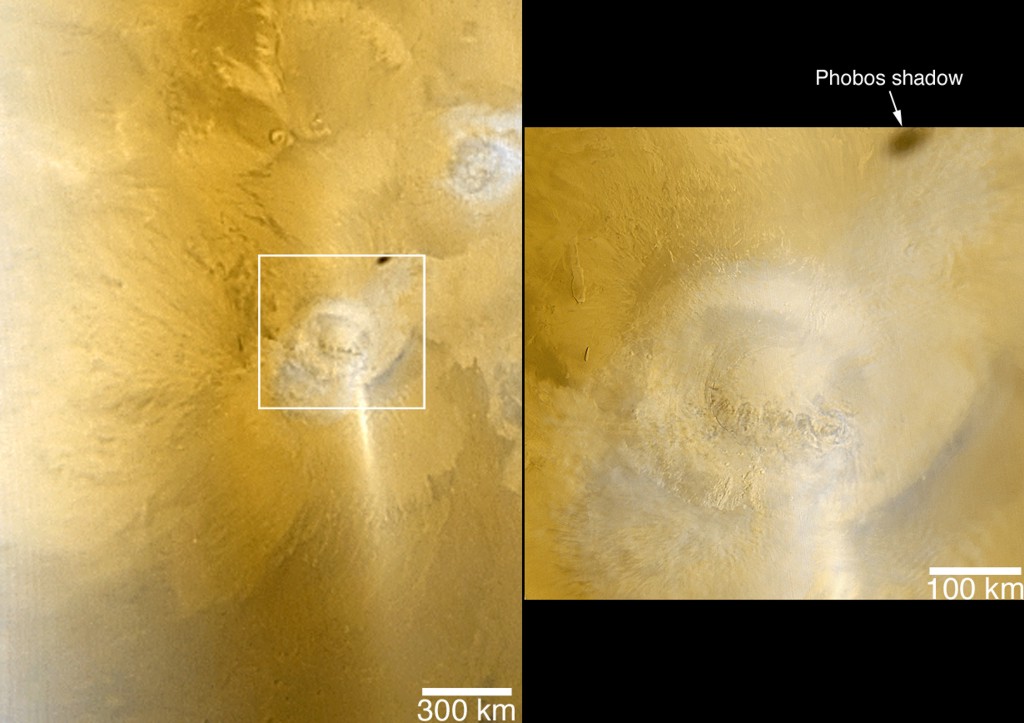 Am 28. Januar 2006 machte Mars Global Surveyor ebenfalls ein Bild des Phobosschattens auf der Marsoberfläche neben dem Vulkan "Arsia Mons", dem südlichsten der drei Tharsis-Vulkane. Ein Beobachter auf der Marsoberfläche hätte in diesem Gebiet eine etwa 21 Sekunden dauernde partielle Sonnenfinsternis beobachten können. |