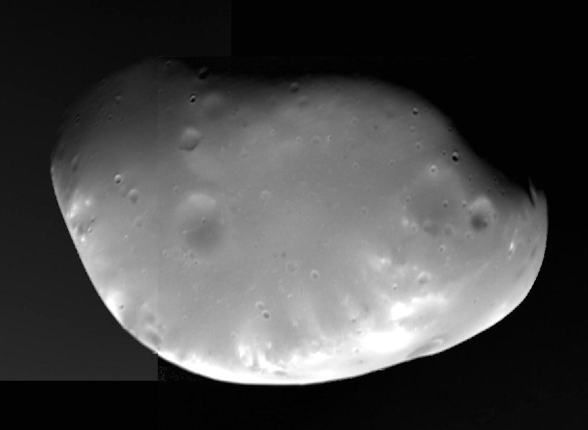 Stickney, der das Aussehen des Mondes dominiert. Wie man außerdem sieht, ist trotz der geringen Schwerkraft auf diesem kleinen Mond (etwa 1/1000 der Erdschwerkraft) der Staub vom Kraterrand von Stickney im Laufe der Jahrmillionen in den Krater hineingezogen worden. Die Originalveröffentlichung ist hier. |