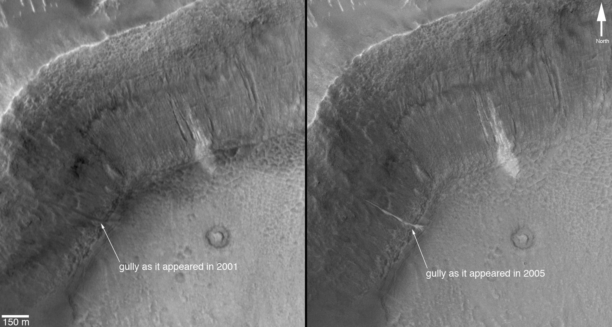Der Wasserausbruch muss zwischen dem 22. Dezember 2001 und dem 26. August 2005 erfolgt sein, wie die bei genau gleichen Beleuchtungsverhältnissen aufgenommenen Bilder zeigen. Man sieht eine helle Schicht von Eis oder Salzrückständen, die unter der Oberfläche verborgen bei einem spontanen Wasserausbruch entstanden sein müssen. Da die Bedingungen der Marsatmosphäre an dieser Stelle keinerlei freies Wasser zulassen, kann es sich nur um Rückstände des eigentlichen Ausbruchs handeln. Die Originalveröffentlichung ist hier. |