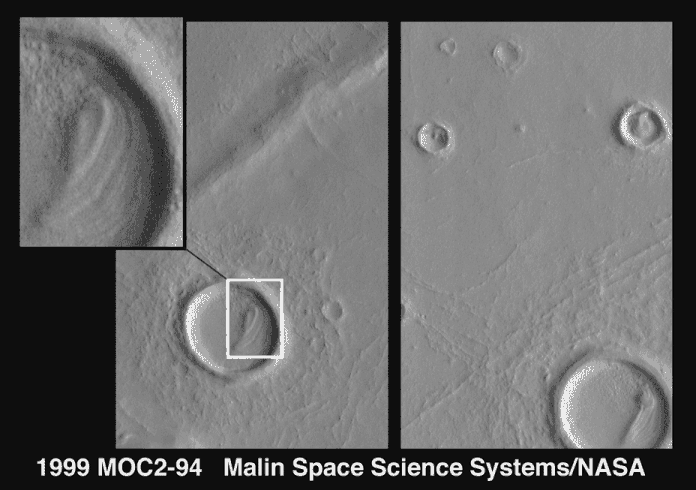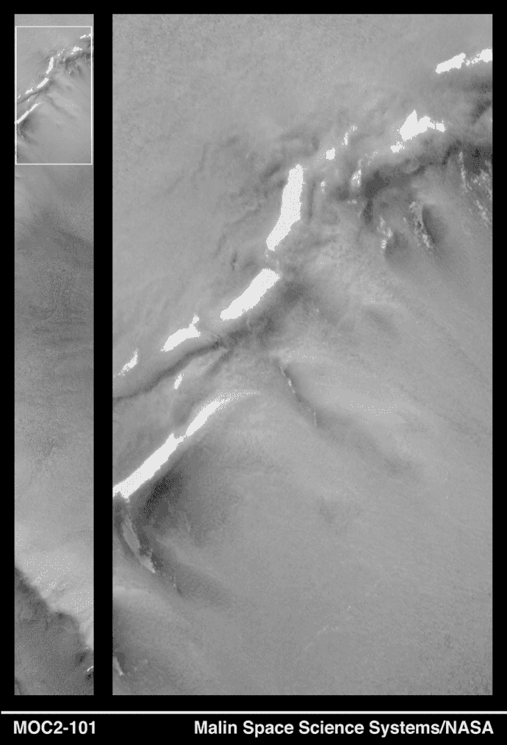 mit dem früheren Vorhandensein von Wasser in Einklang zu bringen wäre. Ergebnisse dieser Art sind die dominaten Ergebnisse der Mars Global Surveyor-Mission wie sie in früheren Missionen nicht möglich waren. Erst die extrem hohe Auflösung der MGS-Kamera erlaubt Bilder dieser Art. Durch Klicken auf das nebenstehende Bild erhält man ein vergrößertes Bild, die Originaldaten sind hier. |