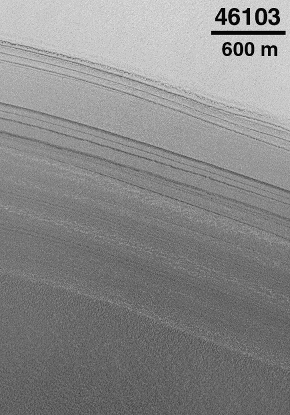 beginnt. Einen ersten Eindruck vom Beginn der kalten Jahreszeit sind auf den weitläufigen Sanddünen zu erkennen, die als breiter Gürtel die nordpolare Eiskappe des Mars umgeben. Im Lee der sandigen Abbruchkanten sind erste Frostansammlungen zu erkennen. Außerdem ist die ganze im Bild sichtbare Gegend nahe 74.7N 61.4W mit einer dünnen, aufhellenden Frostschicht überzogen, denn diese Gegend erscheint im Sommer sehr dunkel, fast schwarz. Das Bild hat eine Auflösung von etwa 7m/Pixel und überstreicht ein Gebiet von etwa 3km. Das Licht kommt von oben rechts und die etwas 'grobkörnige' Struktur des Bildes ist auf den in der Atmosphäre lagernden dünnen Nebel und leichten Wolken zu dieser Jahreszeit zu erklären. Durch Klicken auf das Bild erhält man eine vergrößerte Ansicht, die Originalveröffentlichung ist hier. |